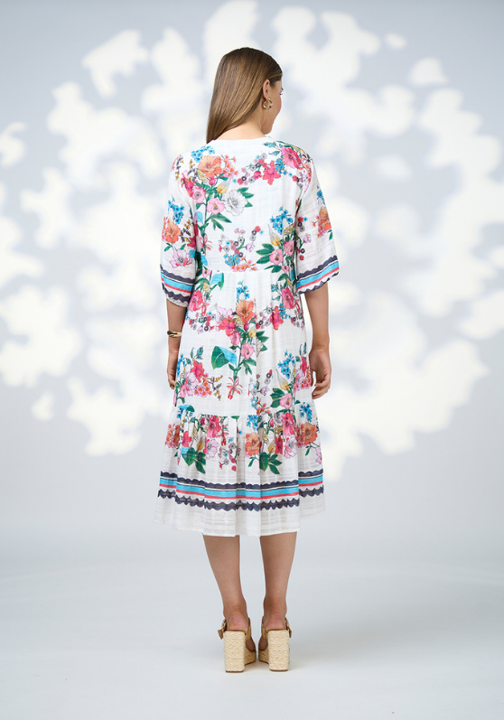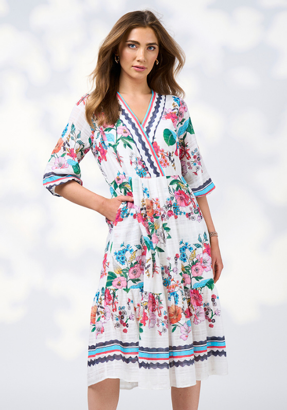 Printed cotton midi dress in a textured cotton with a faux wrap neckline and princess shaped seams. Contrast print accentuates neckline, sleeves and hem panels. Featuring hidden in-seam side pockets. Fully lined.