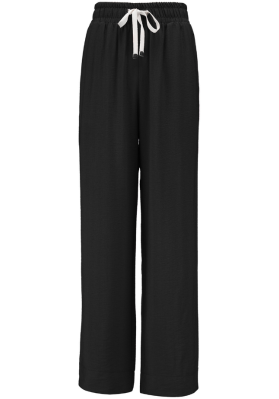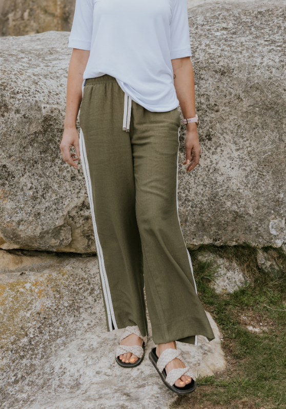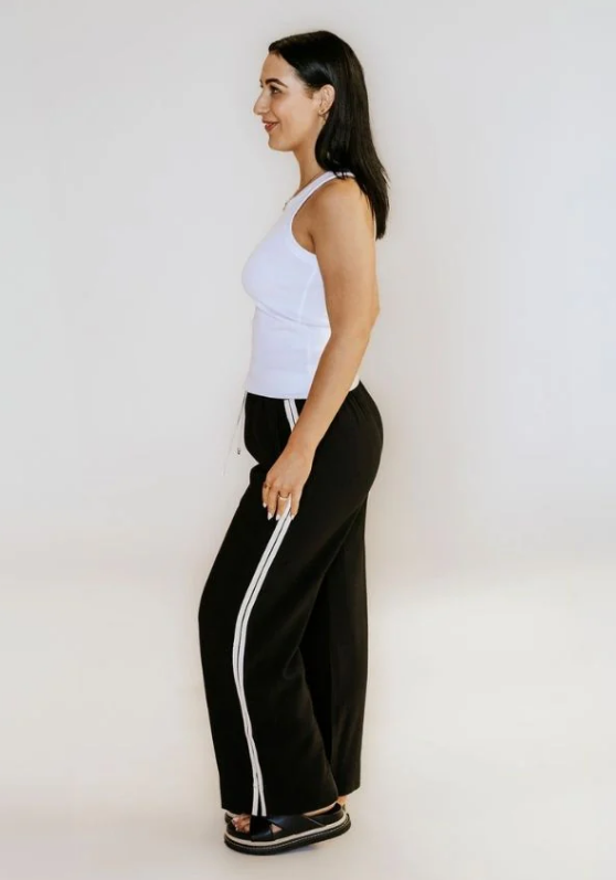 Cream contrast stripes run down each leg for a sport-luxe edge, while subtle side splits at the hem add movement and a touch of ease. The fit is streamlined yet relaxed, with a wide-leg silhouette that flatters every shape and pairs beautifully with tanks, tees, or a crisp shirt.