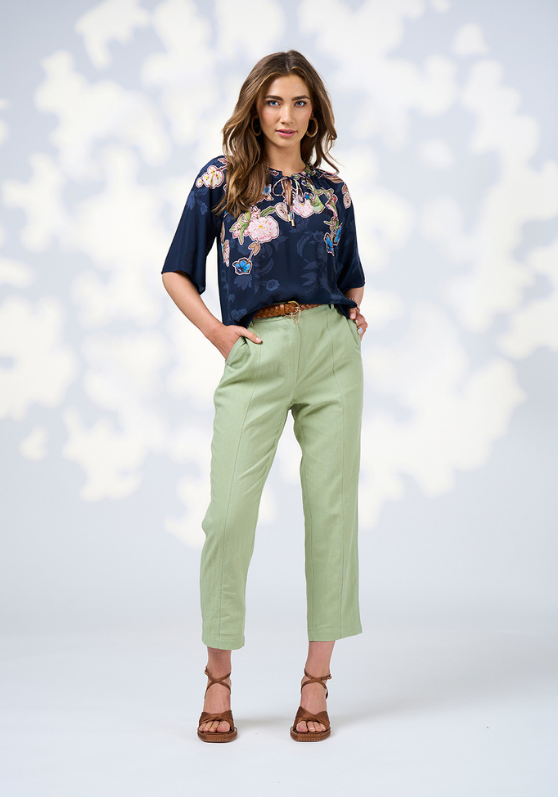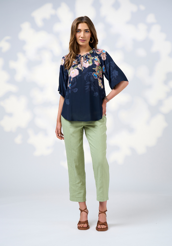 Relaxed fit raglan blouse with floaty sleeves, featuring a tie neckline and ruffled collar.