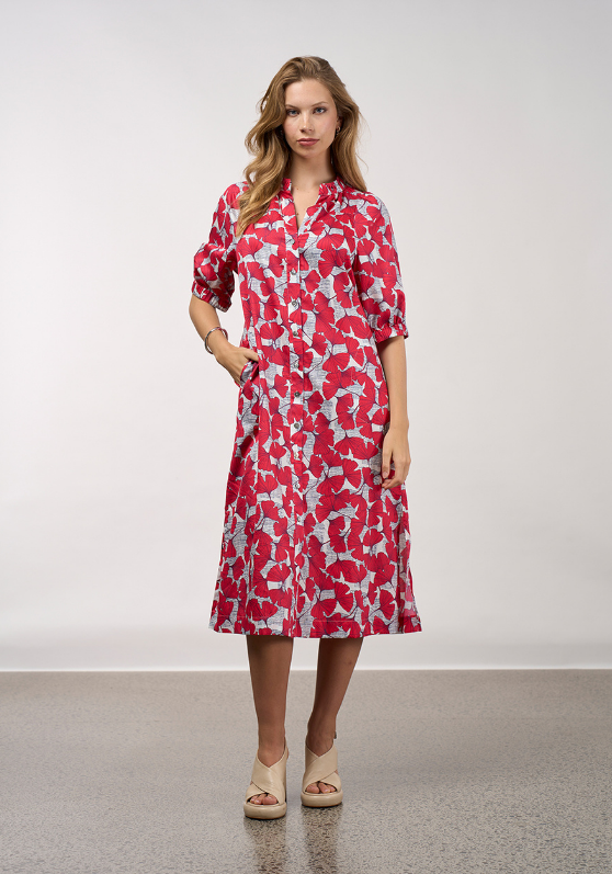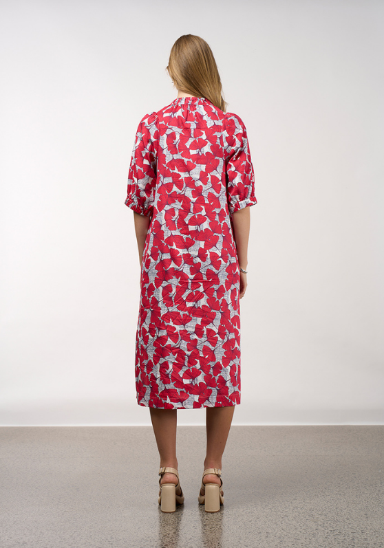 A printed, button-through dress, with a soft gathered neck band. Featuring stitched down in-seam pockets, blouson sleeves with elasticated cuffs and deep splits at the hem.