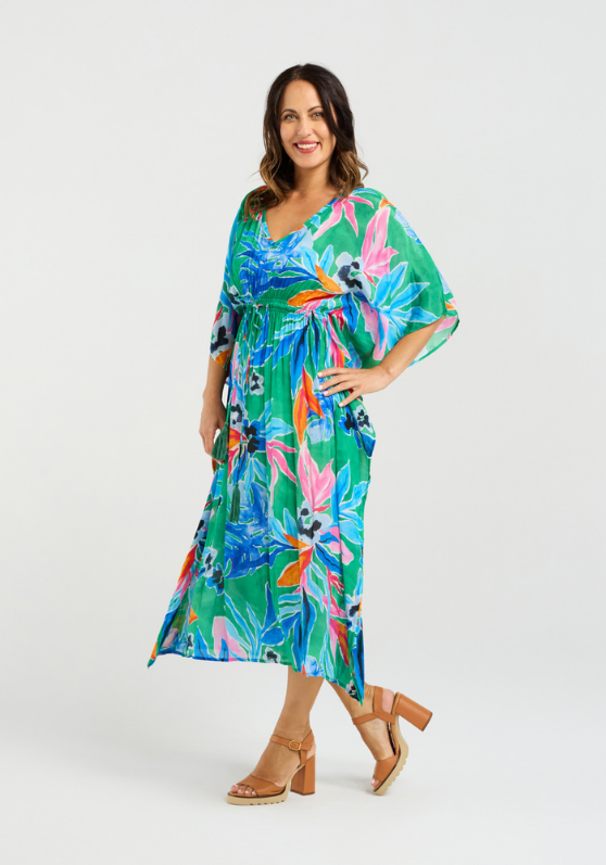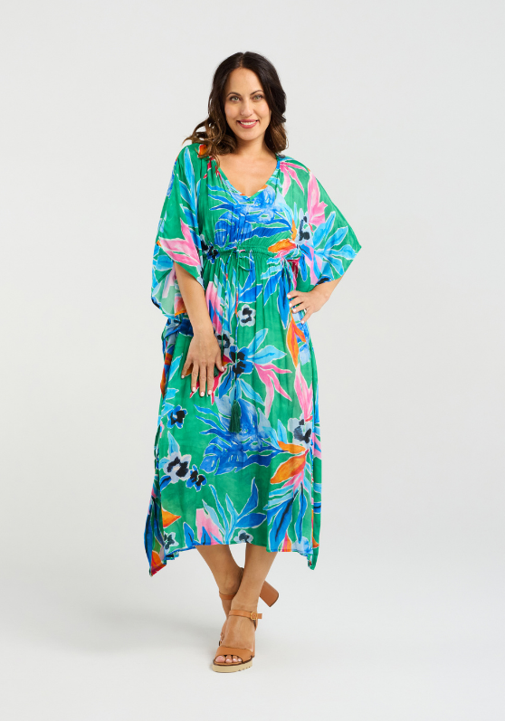 This breezy kaftan features a relaxed silhouette brought to life by a vibrant tropical print, evoking a sense of effortless vacation style. Designed with a waist tie for adjustable shaping, it flatters the figure while maintaining a flowy, laid-back feel.