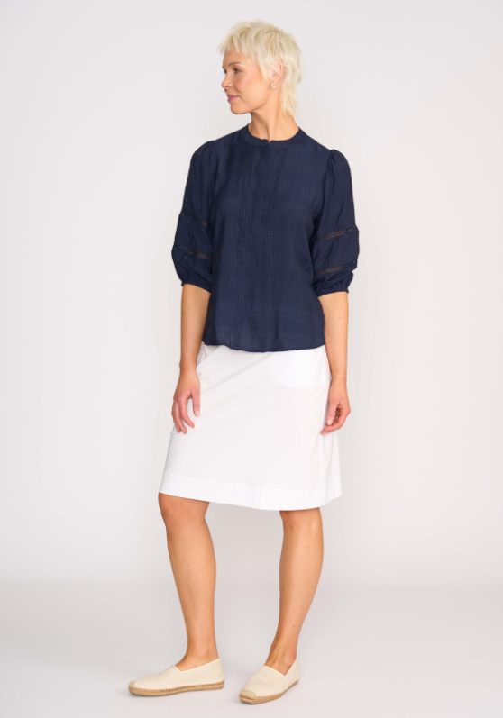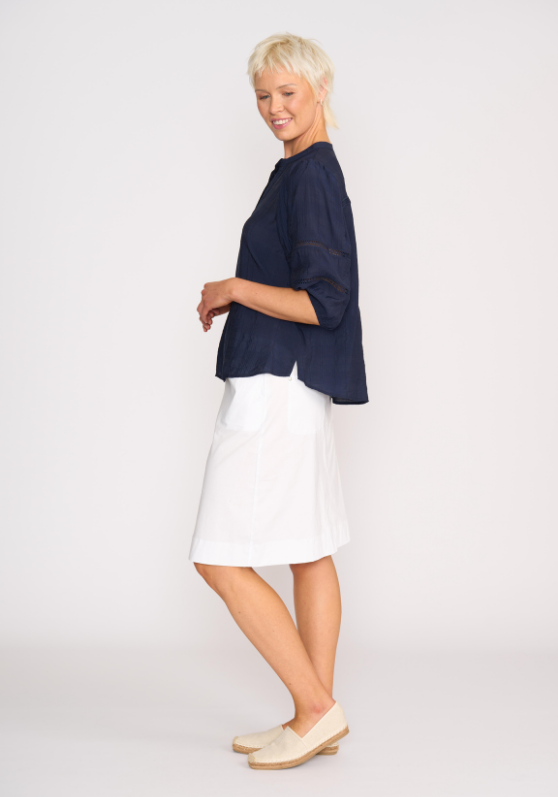Classic and comfortable pull on skirt. Back patch pockets and front pockets for all you need to carry.