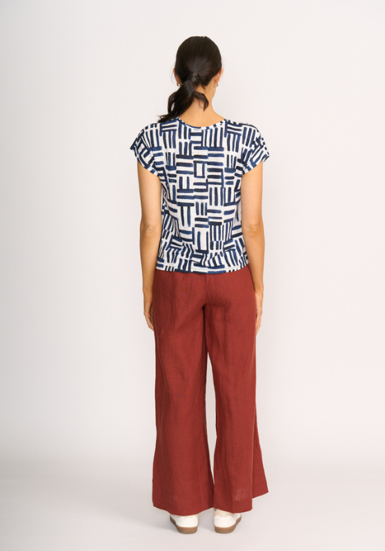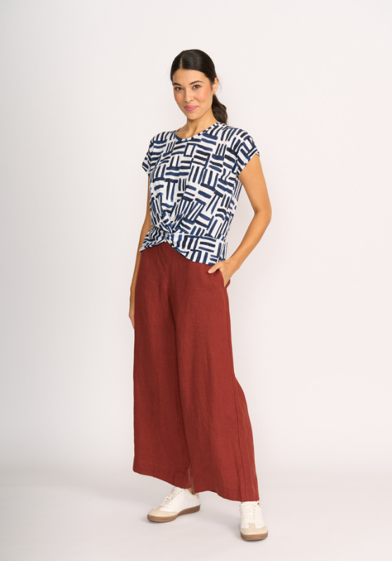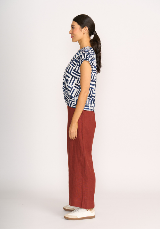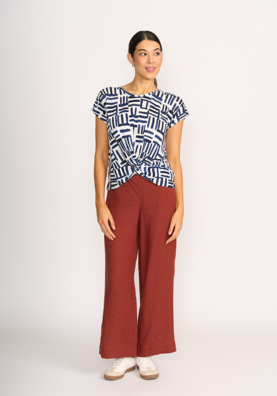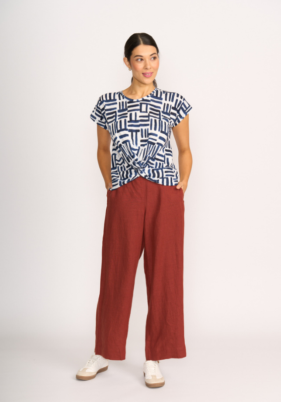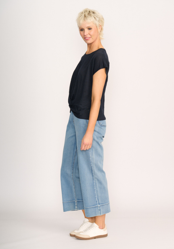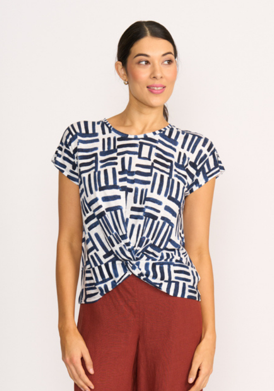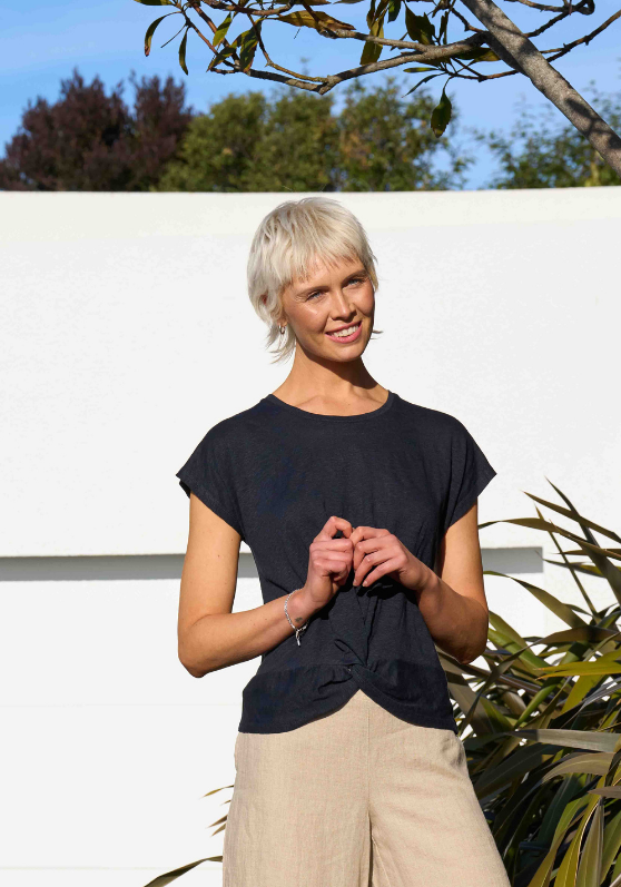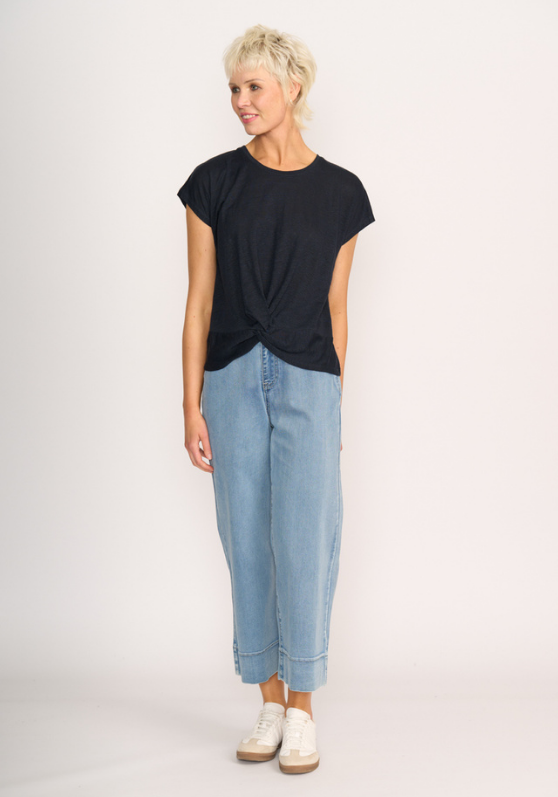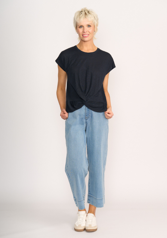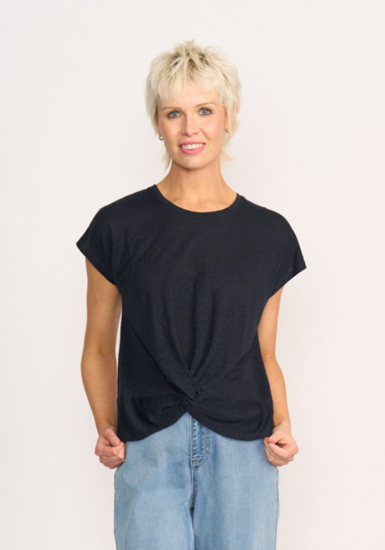 A short sleeve tee with a twist, literally! A scoop neckline and relaxed fit.